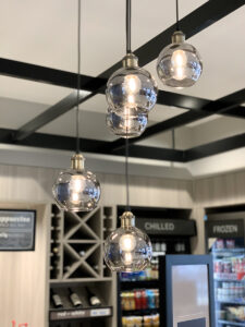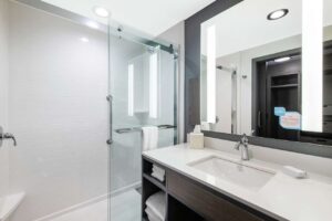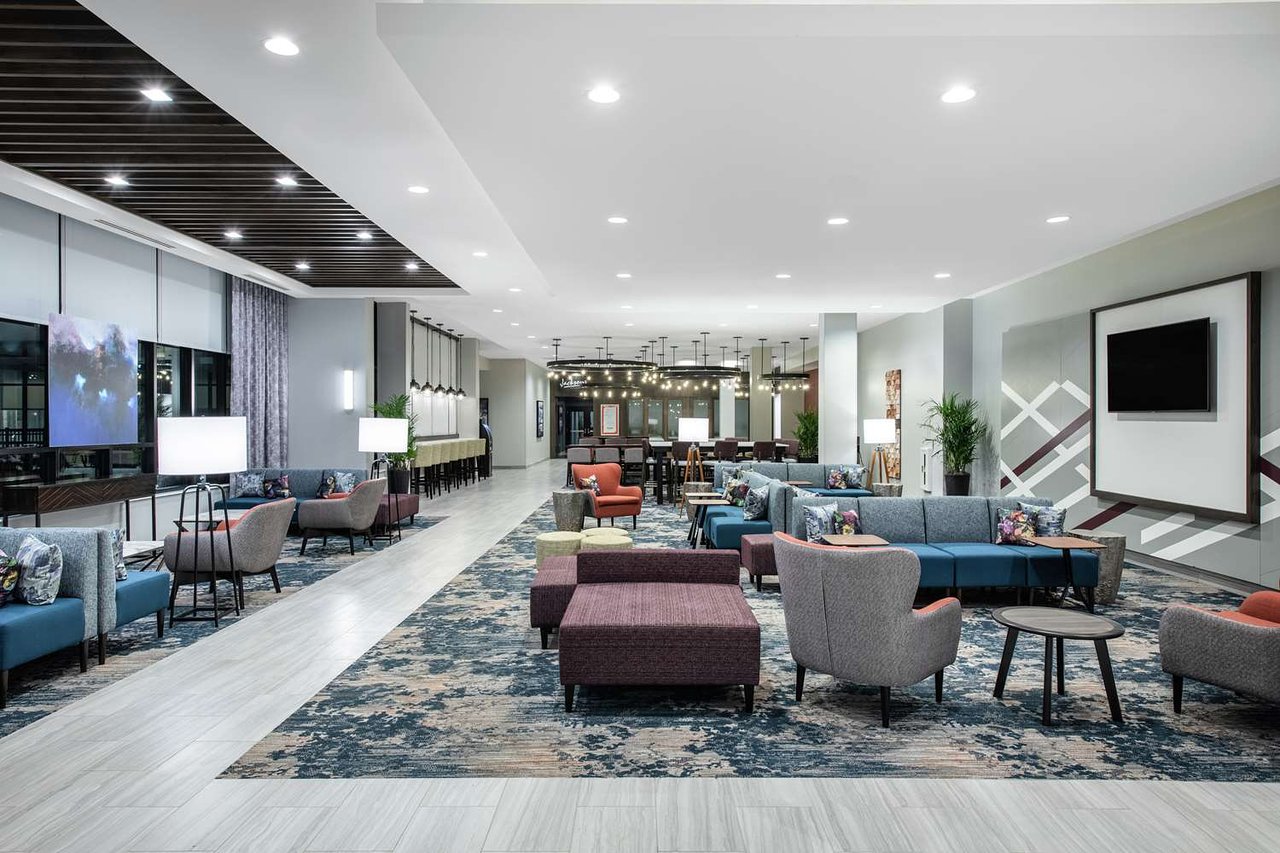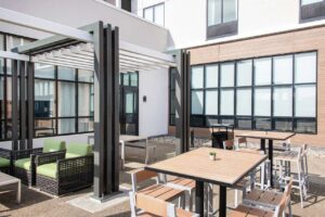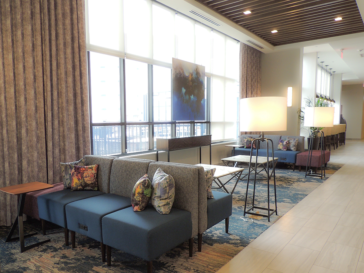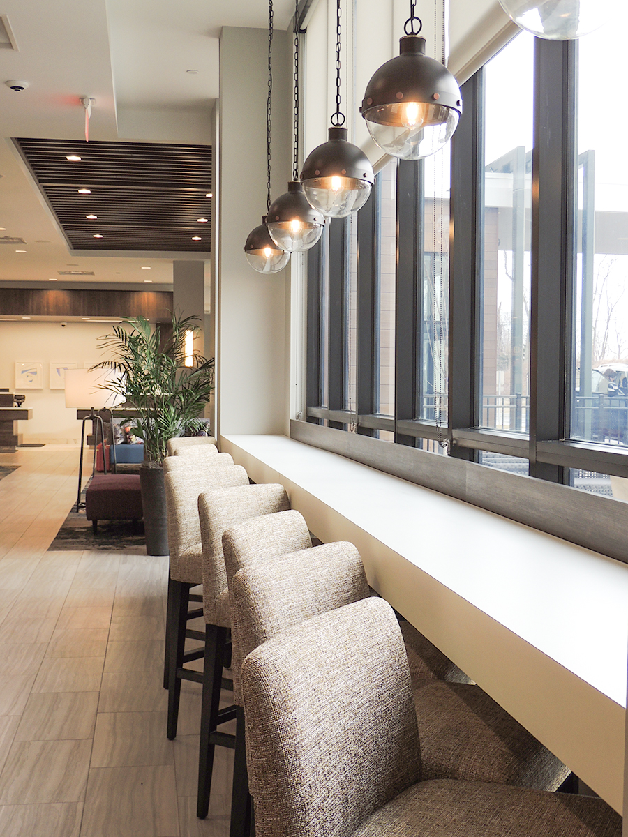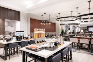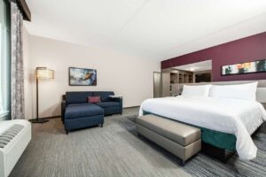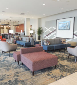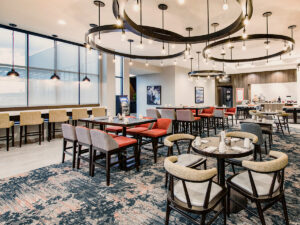 The hotel’s contemporary design reflects an urban feel that includes mid-century and industrial accents. The customized color palette of calming blues, plum, and striking pops of orange shapes a casual yet inviting atmosphere to promote gatherings and relaxation. The lobby and breakfast area offer a variety of seating styles and groups for conducting business or lounging – even an outdoor patio that includes a firepit. The guestrooms take a more simplistic approach, focused on a fresh and calm aesthetic with minimal pattern.