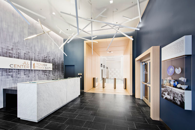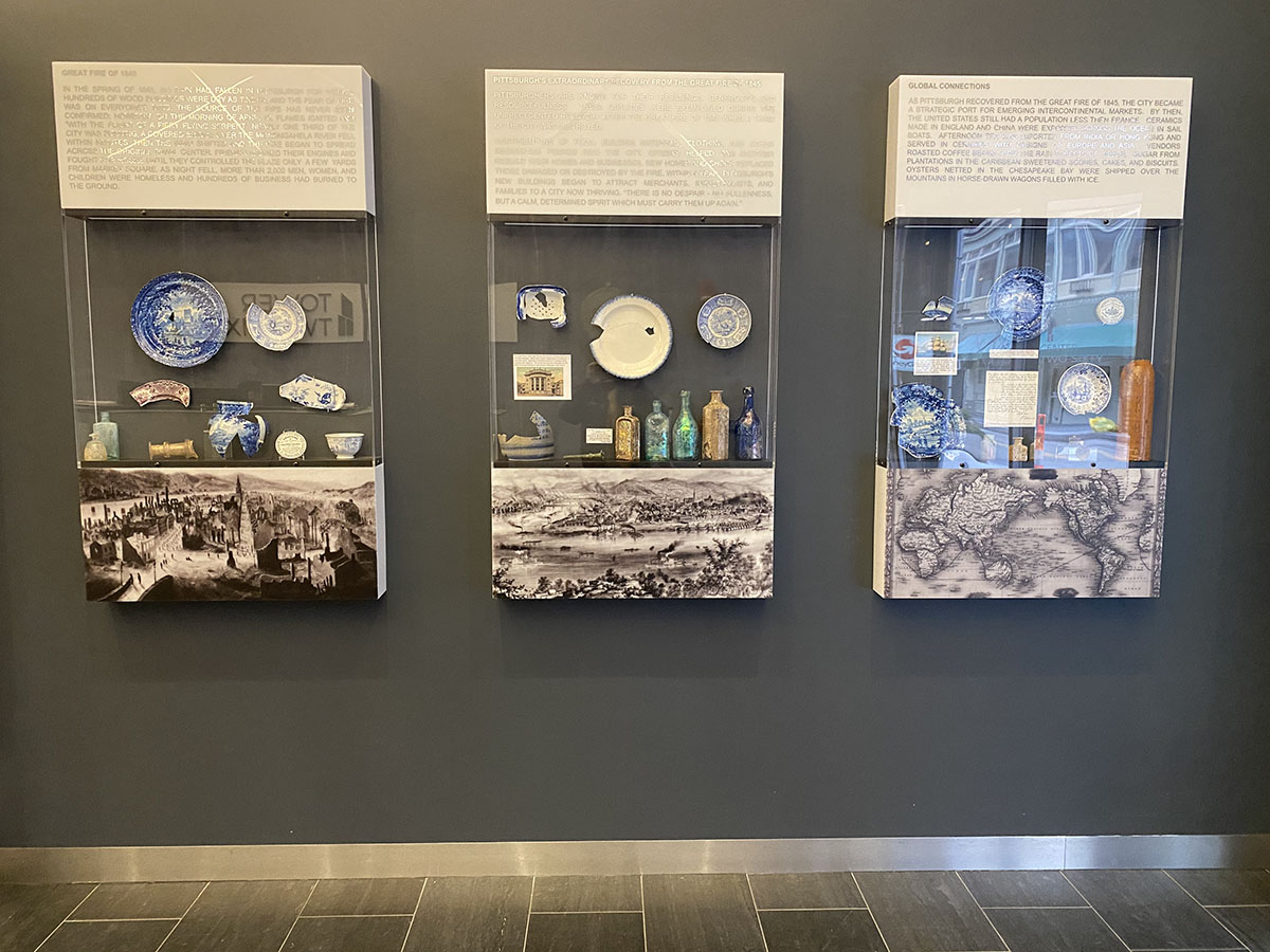 Piatt Companies’ Interior Design team selected the corridor finishes, furnishings, artwork and signage for the modern offices located on the 15th floor of Tower Two-Sixty. They also helped curate the display cases located in the main lobby that house artifacts found during the excavation of the site. The display cases feature narratives about The Great Fire of 1945, and Pittsburgh’s recovery after the fire. They also discuss Pittsburgh’s global connections and how the city became a strategic port for emerging intercontinental markets.